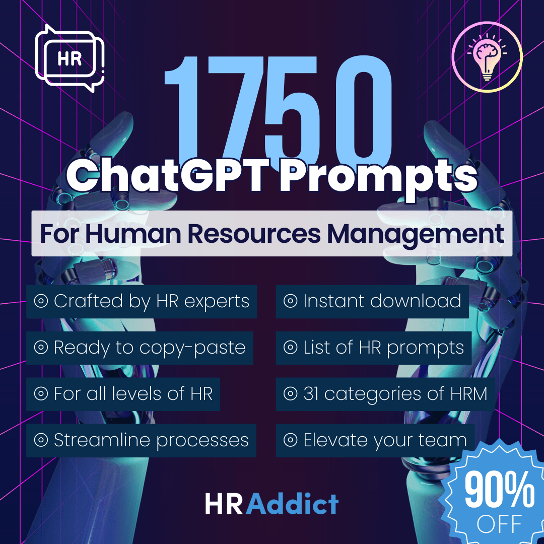Elevate your HR performance with our collection of 1,750 ChatGPT Prompts for Human Resource Management – a dynamic resource crafted to streamline HR processes using cutting-edge AI.