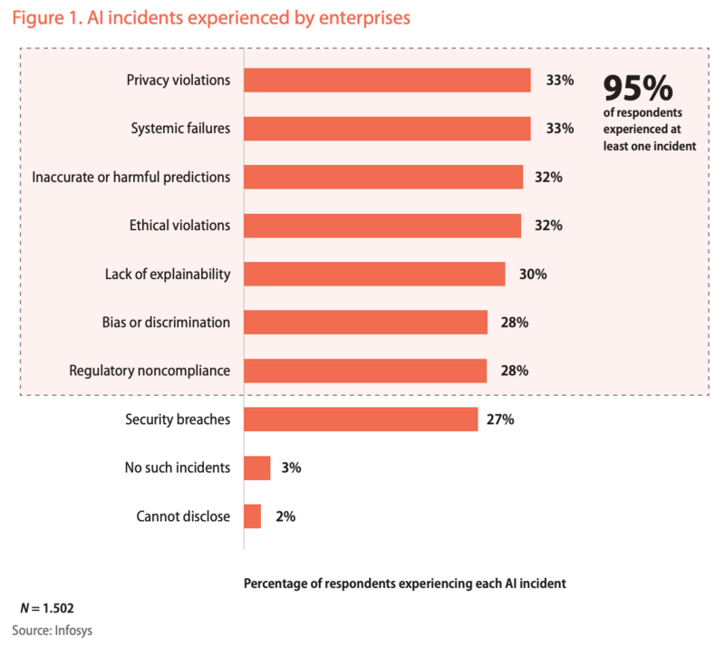 Digesting the data: A recent Infosys report reveals that 95ļ¼ of C-suite and director-level executives have encountered at least one problematic incident related to AI, with privacy violations and systemic failures topping the list at 33ļ¼ . These incidents have led to significant repercussions: 77ļ¼ reported financial losses, 53ļ¼ faced reputational damage, and 46ļ¼ dealt with legal consequences, including fines and settlements.Ā