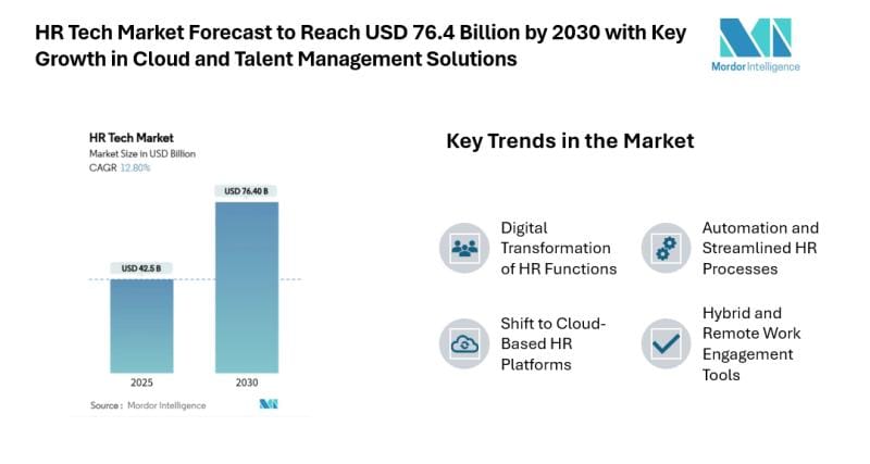 Digesting the data: The global HR technology market is projected to grow from USD 42.5 billion in 2025 to USD 76.4 billion by 2030, reflecting a robust 12.8% annual growth rate. This expansion is driven by enterprises increasingly adopting HR platforms as strategic tools to enhance talent management, payroll, workforce analytics, and employee engagement. Key growth drivers include the shift toward cloud-based platforms, AI-driven workflows, and hybrid work engagement tools.